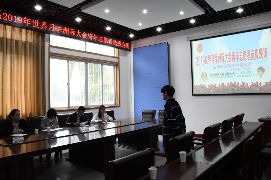 团市委于2019年3月15日召开2019世界月季洲际大会青年志愿服务工作动员会。学校领导高度重视该项工作,在市委召开动员会后,迅速对我校青年志愿者招募工作进行了落实。3月22日下午,在学校团委的周密部署和各院系团总支的配合下,我校2019世界月季洲际大会志愿者招募活动在孔明路校区进行,团委书记周大鹏、应用外语与国际教育系党总支书记王纪信及翻译团队老师参加本次招募活动,南阳市电视台也对本次活动进行了采访。