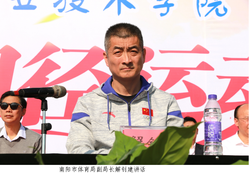 南阳市体育局副局长解钊建在讲话中代表南阳市体育局向运动会的召开表示热烈的祝贺,在充分肯定学校近年来为南阳职业教育和体育事业发展做出的重要贡献后,希望我校师生员工在工作中学习女排精神,突破极限,超越自我,在生活中提高体育意识,走向户外,强健体魄,充分享受健康人生。