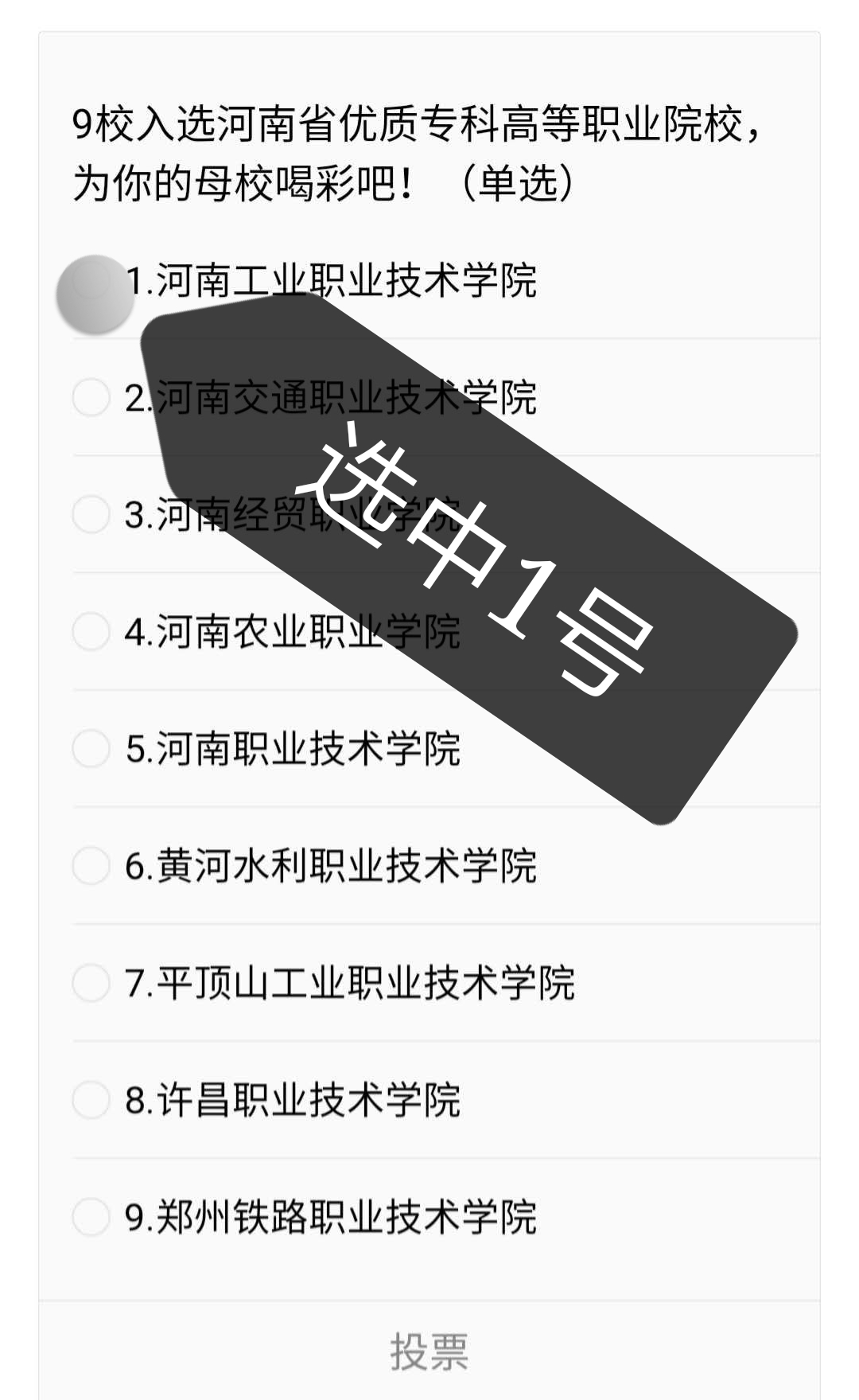 方法二:打开微信朋友圈链接“认定9所优质校!河南高职发展行动计划(2015-2018年)项目推荐名单公布”,为1号河南工业职业技术学院投票。