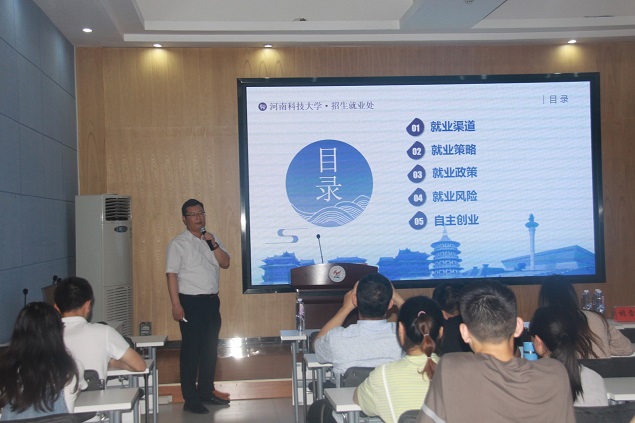 5月22日下午,河南科技大学招生就业处处长易军鹏受邀来我校为本科班学生作就业创业专题报告。学校副校长王仁伟,招生就业处处长胡雪梅,相关院系就业工作人员,2015级、2016级本科班全体学生及班主任参加报告会。报告会由胡雪梅主持。
