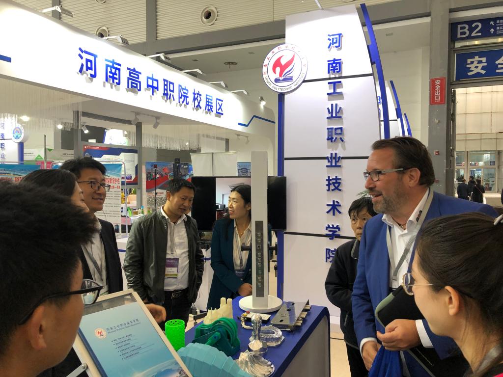 2019年11月7-9日,2019中国(西安)世界职业教育大会暨展览会在西安顺利举行,作为国内目前唯一专注于职业教育在对外合作与校企合作等应用解决方案的国际展览平台,本届大会以“面向未来的产教融合协同育人与应用型人才培养”为主题,汇集了来自德国、法国等欧盟国家和国内职业教育领域的知名教育专家,教育行政部门以及国内外教育装备、教育信息化企业和职业院校的代表参会。河南省教育厅统一安排部署,组成河南省高中职院校展团,我校作为教育厅推荐的6所院校之一参展。党委书记温道军、副校长杜建根携科技外事处、机械工程学院、机电自动化学院、应用外语与国际教育系、产教融合发展中心、省工业嵌入式网络控制工程技术研究中心等相关部门领导、老师一行11人参会。
