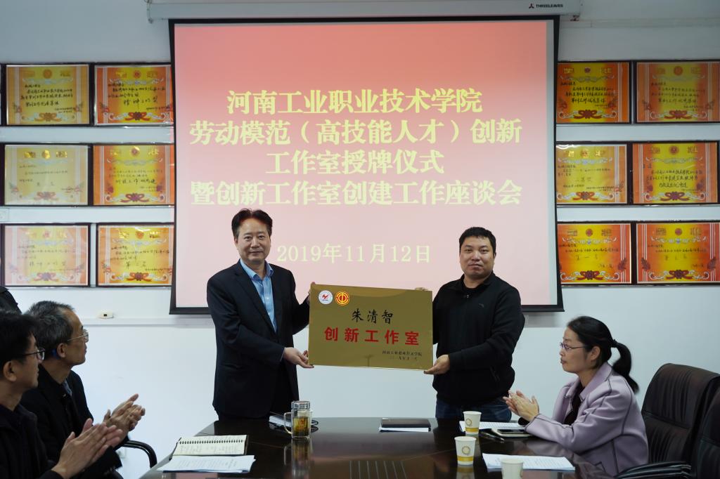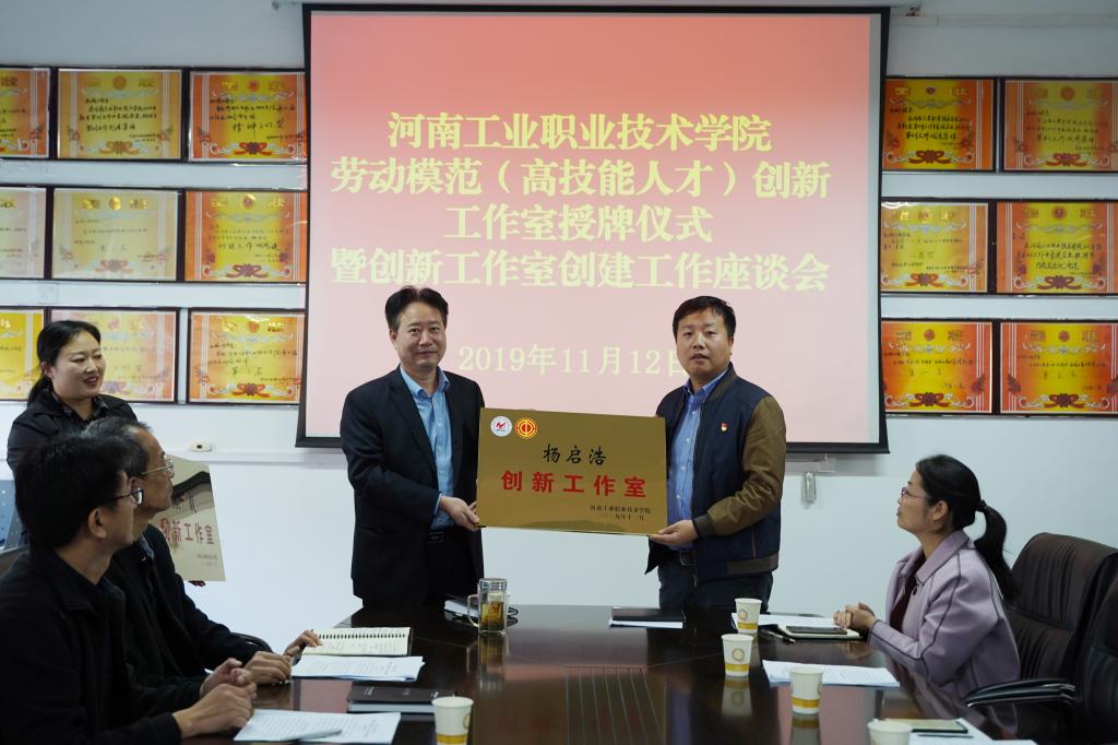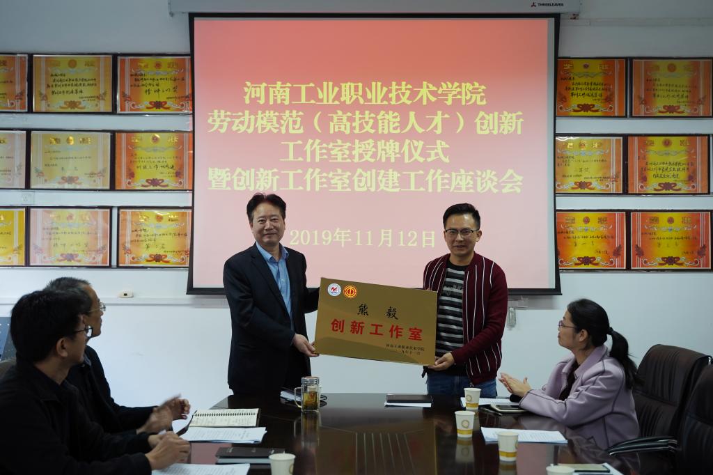 首先,王劲松宣读了《关于命名河南工业职业技术学院“职工创新工作室”的决定》(豫工院工﹝2019﹞5号)和《河南工业职业技术学院劳动模范(高技能人才)创新工作室管理办法》(征求意见稿)两个文件;接着,屈保中对创新工作室进行了授牌。
