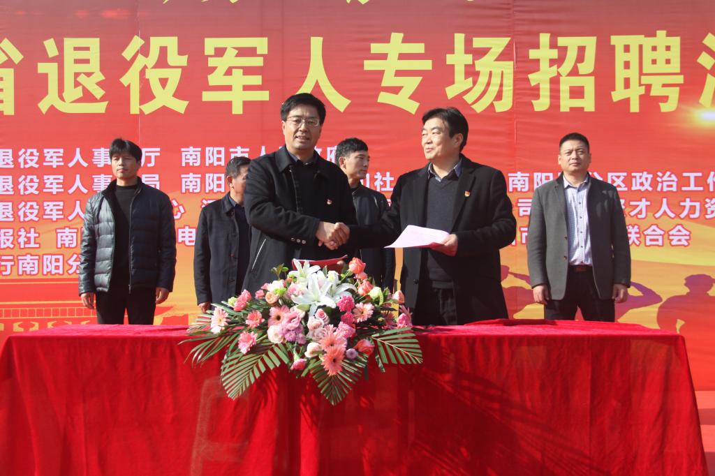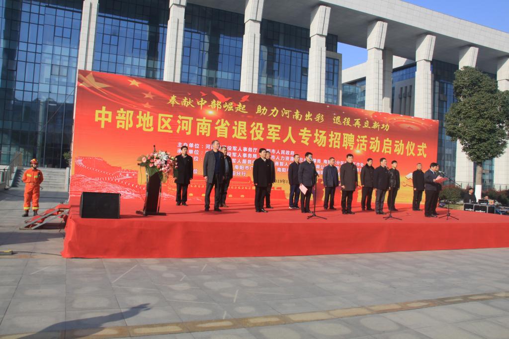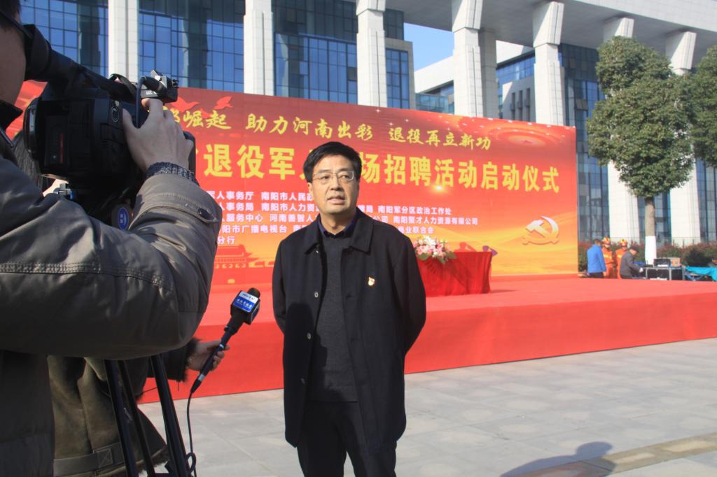 2019年12月11日,中部地区河南省退役军人专场招聘活动启动仪式在南阳市市民服务中心广场举行。此次活动由河南省退役军人事务厅、南阳市人民政府主办,南阳市退役军人事务局、南阳市人力资源社会保障局承办。河南省退役军人事务厅纪检监察组组长刘长富,南阳市人民政府副市长戚绍斌等有关领导出席启动仪式,我校副校长贾庆成应邀参加活动并接受新闻媒体采访。