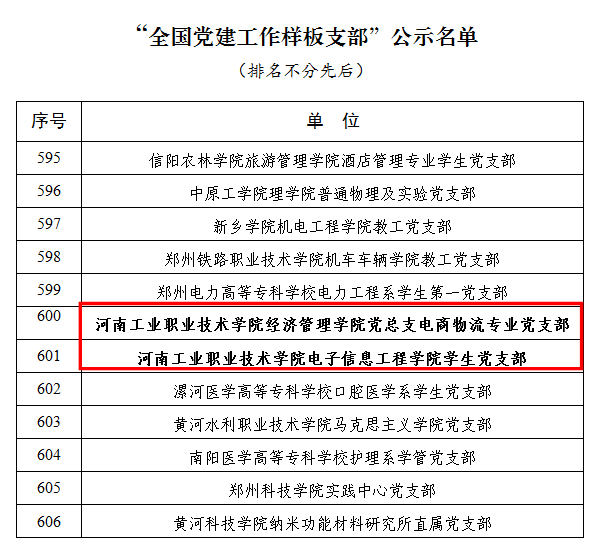2019年12月12日,中华人民共和国教育部发布《关于对第二批新时代高校党建示范创建和质量创优工作结果的公示》,我校经济管理学院电商物流专业党支部、电子信息工程学院学生党支部被公示为“全国党建工作样板党支部”培育创建单位。(供稿/党委组织部 撰稿/唐锋 部门审核/白西乔 编审/侯卓)