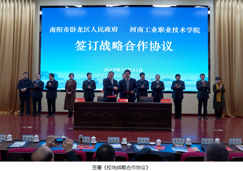 12月31日上午,我校与卧龙区人民政府校地战略合作协议签约仪式在学校大报告厅隆重举行。卧龙区委书记高贤信,区委副书记徐大鹏,南阳光电产业集聚区管委会党工委副书记、常务副主任李宛生,区委常委、纪委书记李筱珂,区委常委、组织部长李廷武,区委常委、副区长周坚定,区委常委、宣传部长金键,区委常委、区委办公室主任孙林儒,区委常委、统战部长张红岩,区政协副主席、党组副书记张建勋,南阳光电产业集聚区管委会党工委委员、副主任姚章玉;学校党委书记温道军,副校长杜建根、刘纪山、贾庆成,工会主席屈保中,副校长樊有平出席签约仪式。卧龙区区直单位、光电园区、乡镇街道、重点企业负责人以及学校各部门负责同志和教师代表参加签约仪式。仪式由杜建根主持。