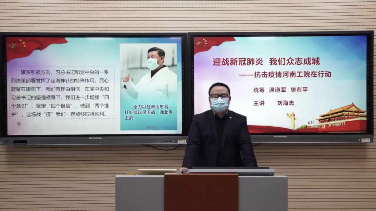学校党委高度重视新形势下网上教学工作,靠前指挥,周密部署,按照《河南省学校新型冠状病毒感染的肺炎疫情防控工作指南及流程图》和河南省委高校工委、省教育厅印发的《关于组织全省高校上好2020年春季开学思政第一课的通知》要求,对第一天上课内容进行了精心安排。聚焦新冠肺炎疫情防控,上午由校党委书记温道军以“同舟共济,勇于担当,在‘战疫’中绽放青春的光彩”为主题给全校师生开讲“开学第一课”,接着校医院医生路超给大家讲解新冠肺炎防控知识,下午由马克思主义学院教师刘海志主讲了“迎战新冠肺炎,我们众志成城”为主题的思政课。