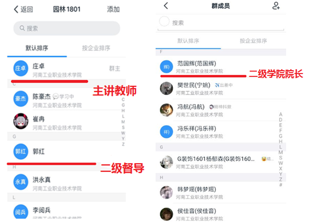 由校级督导、二级学院领导、二级学院督导、专业教研室主任、班主任组成的网上教学管理团队,按专业、年级、班级、课程进行全覆盖教学班级的分工,确保各班级和课程有专人负责,管理人员进入所管班级、所管课程群,与学生同步学习,做到全面覆盖,精准网管,不漏一班、不漏一课、不漏一人。