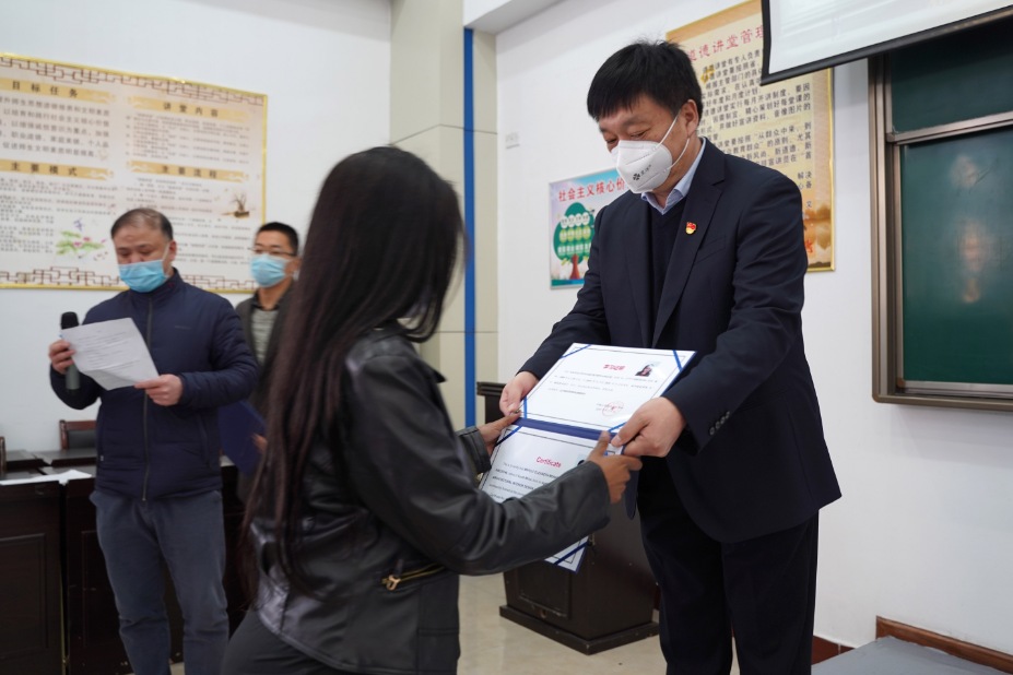 学校党委书记温道军为留学生颁发结业证书,工会主席屈保中为留学生发放纪念品。
