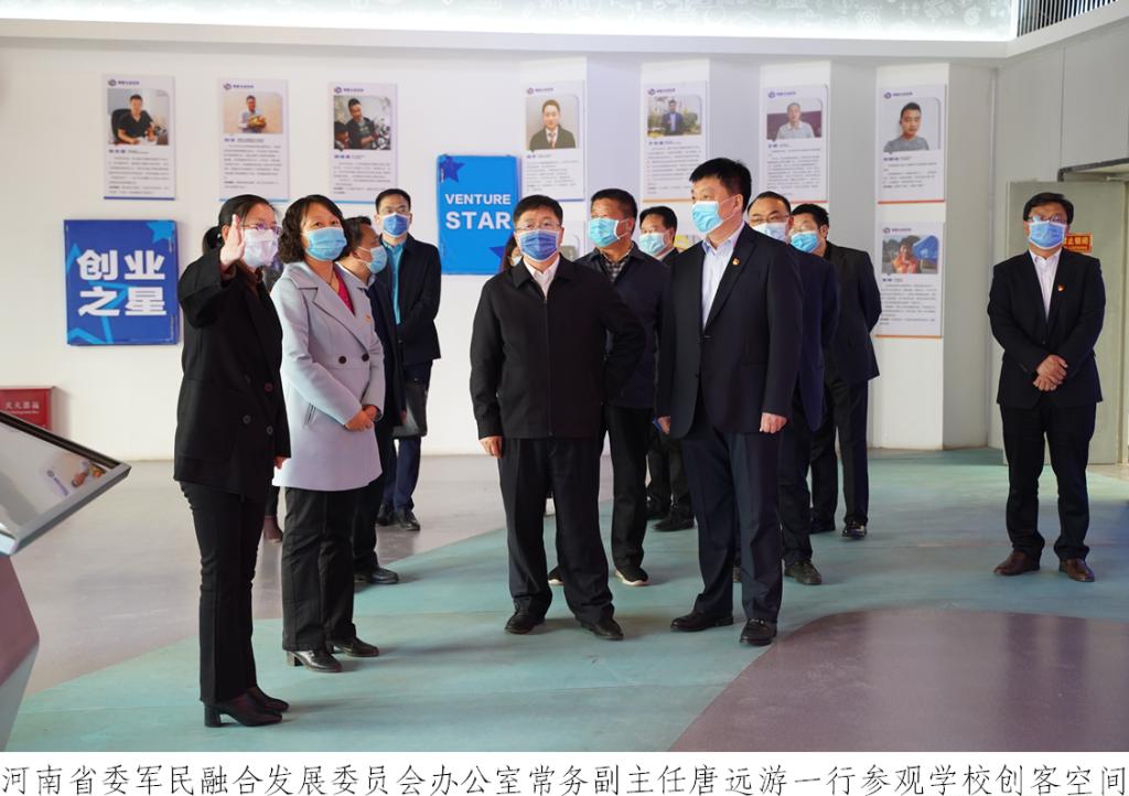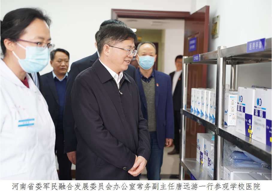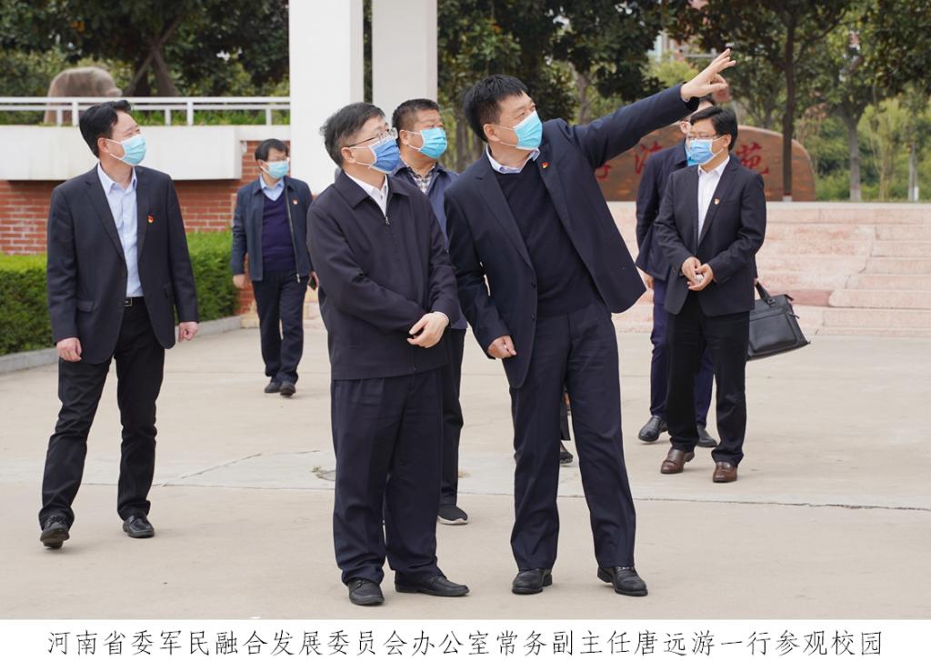 3月23日,在全国全省疫情防控形势持续向好、生产生活加快恢复、学校开学准备有序展开的关键时期,河南省委军民融合发展委员会办公室常务副主任唐远游一行到我校调研指导新冠肺炎疫情防控和学校事业发展各项工作。省委军民融合发展委员会办公室副主任袁玉新、二级巡视员江孝岭、机关党委专职副书记朱云松、机关纪委书记柴志芳、秘书处二级调研员叶青陪同调研。学校领导班子全体成员参加调研。