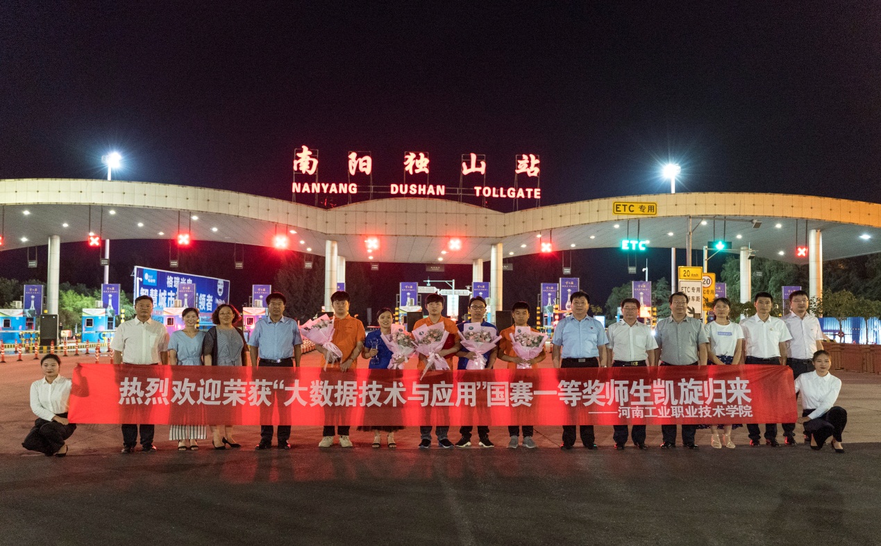 2019年6月14日晚上九点,学校党委书记温道军、副校长贾庆成,党政办、党委宣传部、教务处、电子信息工程学院等部门负责同志一同前往南阳独山站接站,对凯旋归来的参赛师生表示热烈欢迎和真挚祝贺。