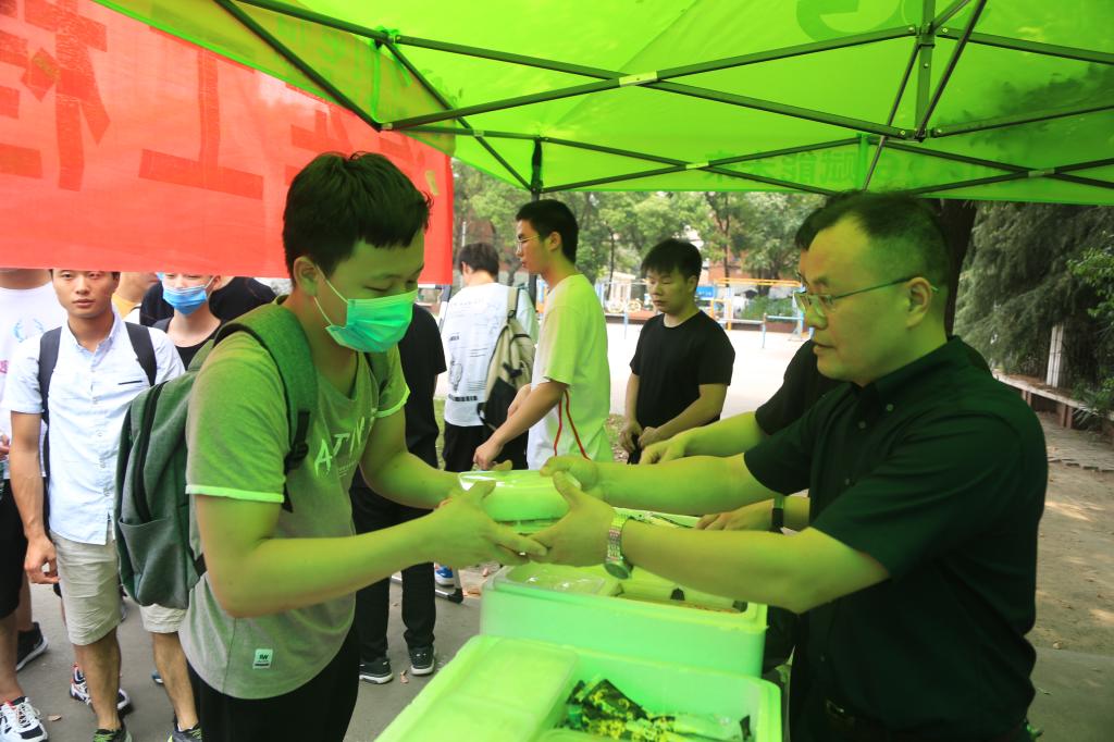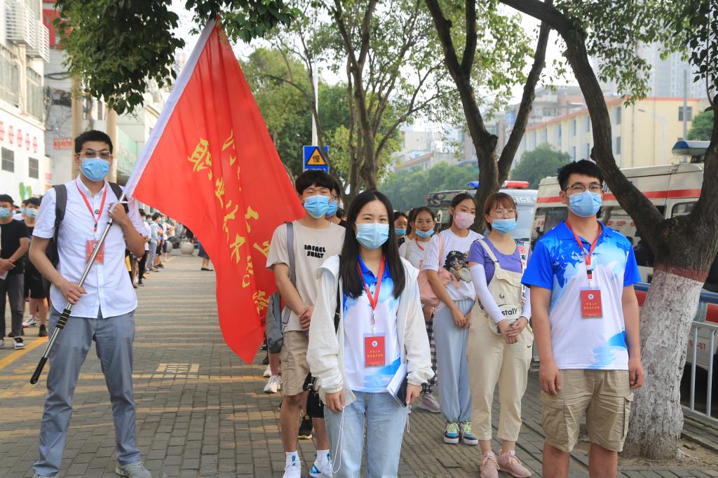 开考前一个小时,各小队带队老师已经抵达考点做好相应的准备工作,他们扛着校旗举着指引牌组织考生有序进场,配合做好考点的防疫健康监测,工作之余还不忘与考生交谈,为他们加油打气。有4名临时发热的考生因为不能乘坐大巴车,所在院系及时启动应急预案,在安排专人专车送考生到考点的途中,积极为考生采取各种物理降温措施,最终保证4名考生全部顺利进入考场参加考试。整个考试过程中,带队老师全程等候在考点外,随时准备为考生服务。