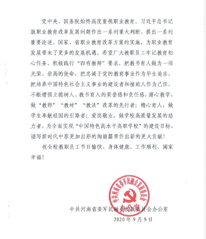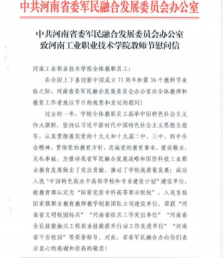 春风化雨育人才,玉壶冰心铸师魂。9月10日下午,我校在孔明路校区大学术报告厅举行庆祝第36个教师节暨表彰大会,表彰在教书育人岗位上勤奋工作、做出突出贡献的优秀教师、优秀教育工作者,并送出饱含省委军民融合发展委员会办公室、南阳市委市政府、学校党委行政满满关怀的教师节慰问。