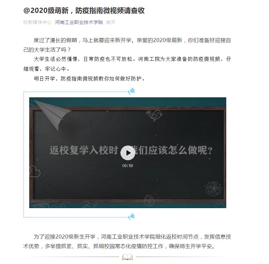 精心组织——确保迎新工作顺利开展。按照疫情防控常态化要求,为了迎接2020级新生开学,学校高度重视,细化学生返校时间节点,制定了详细的迎新工作方案,提前编制学生入校指南,精心策划并制作“五个微视频”,召开迎新和新生入学资格复查工作协调会,精心组织部署,多举措抓紧、抓实、抓细校园常态化疫情防控工作,确保新生平安入校。