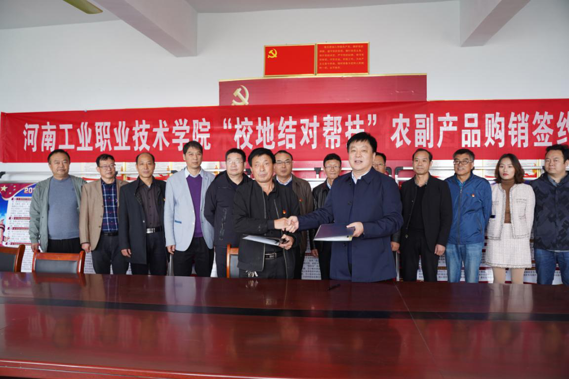 在党群服务中心会议室,党委书记温道军与河坡村签订了价值12万元农副产品购销协议,为扎实做好消费扶贫工作,我校利用学生餐厅和教职工食堂,积极购进河坡村和尹庄村的花生、冬桃、石榴、辣椒等农副产品,落实农副产品进校园活动。