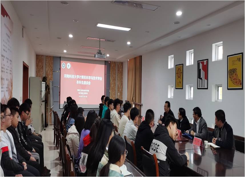2020年11月14日下午,学院与河南科技大学信息工程学院在教师办公楼三楼会议室召开本科生座谈会。河南科技大学信息工程学院院长、博士生导师付主木教授、常务副院长郑国强教授,我校电子信息工程学院院长杜恒教授,学院党政办、教学管理科、教研室负责同志,计算机科学与技术专业2019级、2020级全体本科班同学参加。会议由杜恒院长主持。