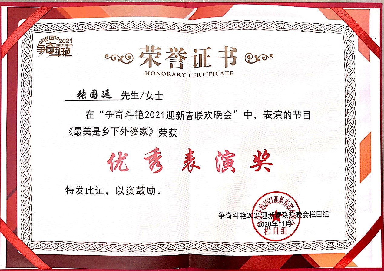 11月21日晚,由向经典致敬全国声乐展演组委会、颂歌中国大型原创词曲选拔组委会联合国内众多文化部门以及文艺机构,共同举办的《向经典致敬》2020首届全国网络声乐大赛暨全国十大原创词曲作品选拔活动以及《颂歌中国》群众最喜爱的原创词曲评选活动的颁奖晚会在北京星光影视园圆满落幕。我校张国廷老师的原创歌曲《不忘誓言》获得银奖,应邀到北京参加颁奖晚会。同时,张国廷新创作的歌曲《最美是乡下外婆家》参加了“争奇斗艳2021迎新春联欢晚会”录制工作,本人荣获“优秀表演奖”。