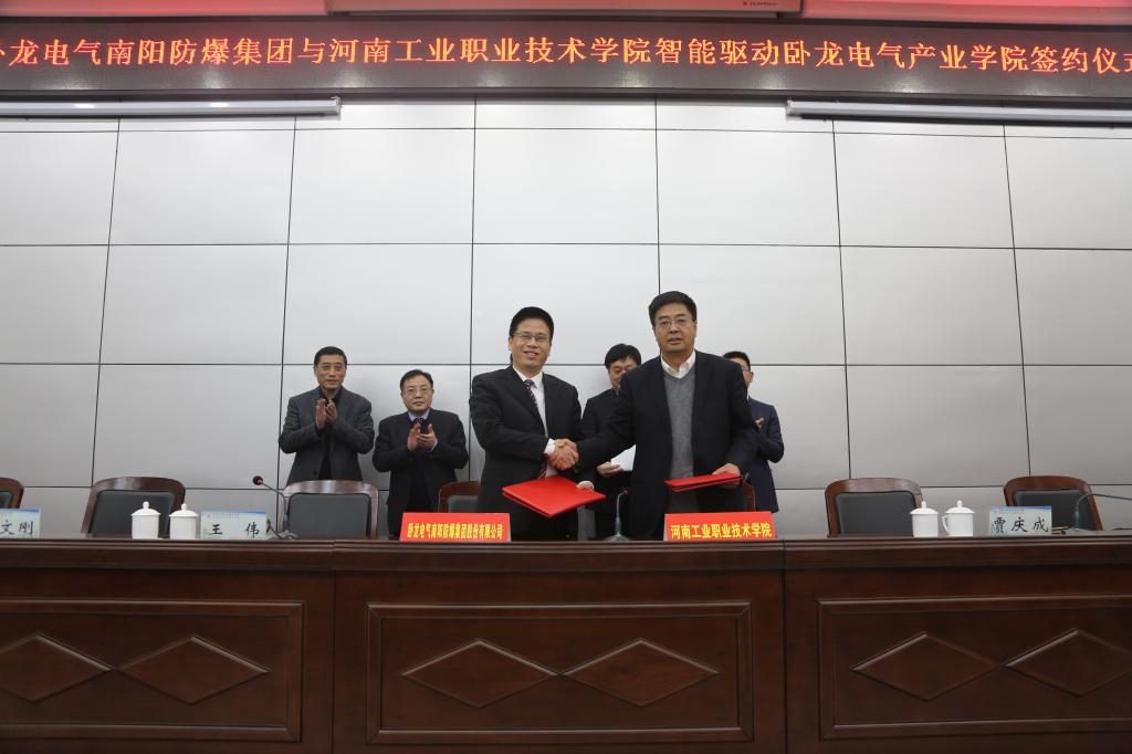 12月8日,学校与卧龙电气南阳防爆集团股份有限公司共建智能驱动卧龙电气产业学院签约仪式,在学校孔明路校区行政楼一楼会议室举行,双方签订了《共建智能驱动卧龙电气产业学院合作协议》。
