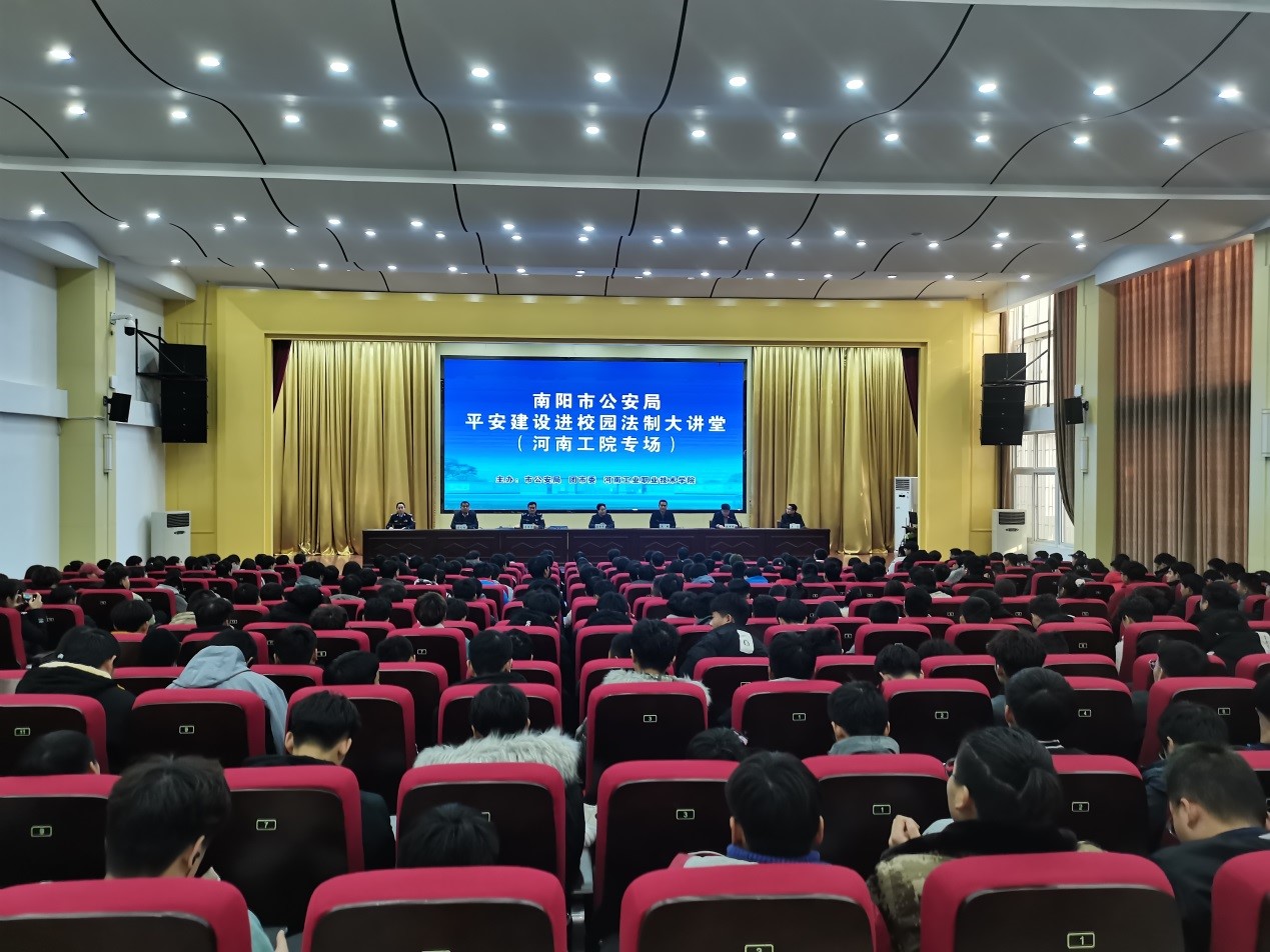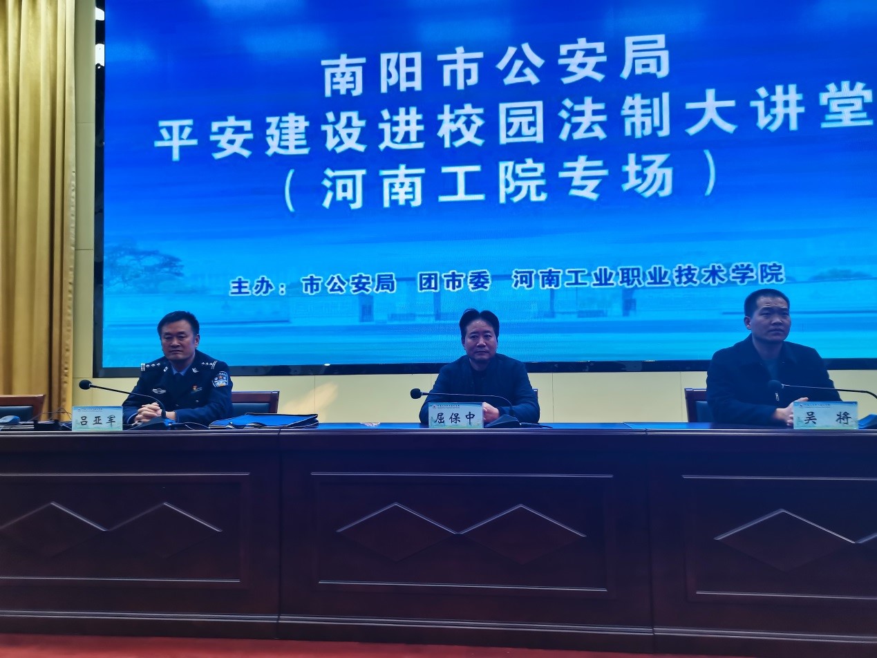 12月15日下午,学校联合市公安局、团市委在孔明路校区大学术报告厅举行平安建设进校园法治大讲堂活动。团市委副书记吴将、市公安局平安建设宣传组组长光武分局副局长吕亚军、校工会主席屈保中出席,学生处、保卫处、校团委负责人以及孔明路校区450余名师生代表参加活动。