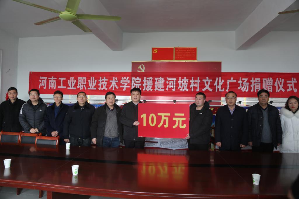 方城县杨集镇河坡村现有299户,1229人,是我校驻村工作队一直帮扶的贫困村,学校领导十分关心河坡村建设发展,为进一步提高广大村民生活质量,丰富村民文化生活,在乡村振兴开局之年,我校捐资10万元帮扶河坡村建设文化广场。1月26日上午,校党委书记温道军、副书记杜建根、副校长王仁伟、刘纪山、贾庆成、樊有平带领党政办、组织部、宣传部、科技处等相关部门负责人到方城县杨集镇河坡村参加河坡村文化广场捐赠仪式,方城县政府党组成员胡凤洲、县政府办副主任王灿、杨集镇副镇长刘博等一同参加。