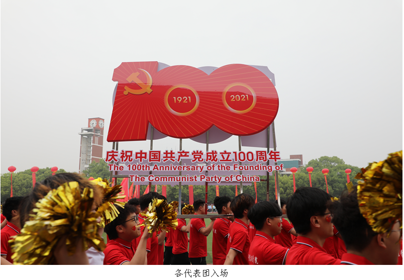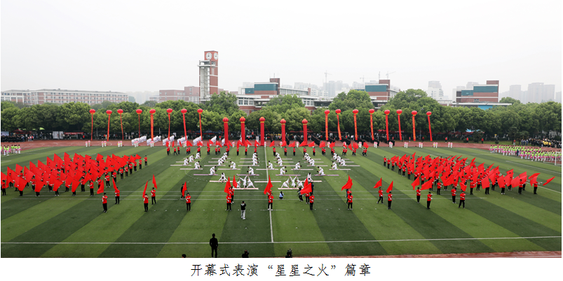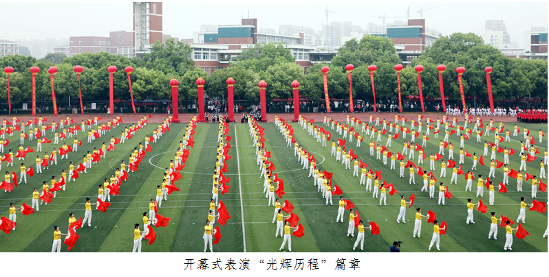 学校把“红色元素”巧妙融入开幕式表演,礼赞建党100周年,将爱党爱校情怀厚植在学生心中。“光辉历程”篇章,四百名学生身着红色服装,挥舞黄色扇子,拼出数字和文字,回顾中国共产党披荆斩棘的光辉历程;“星星之火”篇章,二百名红旗手、五十名瑜伽表演者,以舞蹈造型展现出星星之火的燎原之势;“开拓奋进”篇章,数百名学子以太极拳表演和舞蹈表演,展现了中国传统文化在兼容并蓄、海纳百川的发展过程中的蓬勃生机;“牢记使命”篇章,两百名舞者手持红色牡丹摆出丰富的造型,歌颂伟大的时代,赞扬每一个默默无闻、艰苦奋斗的中国人民;“走向辉煌”篇章,五百名学生簇拥党旗、国旗,深情合唱“我和我的祖国”,在悠扬的旋律中,歌颂党、歌颂祖国,为建党100周年献上真挚的祝福。
