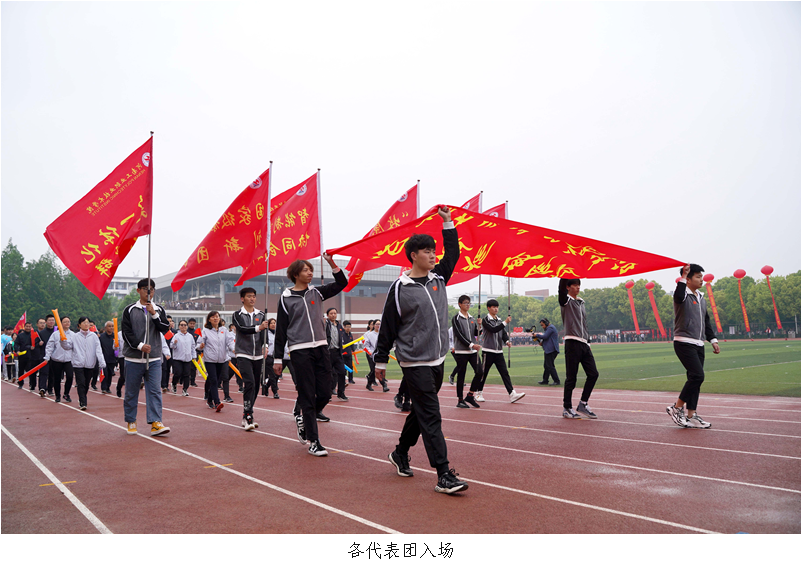 上午8点30分,伴随着慷慨激昂的运动员进行曲,国旗护卫队、军乐团、12个代表团,迈着整齐的步伐、喊着响亮的口号,昂首阔步依次入场,尽展我校师生的飒爽英姿。