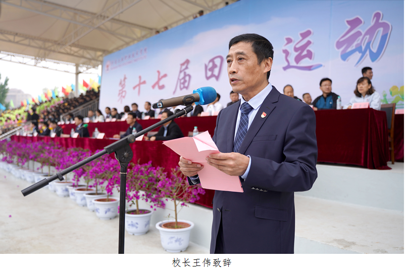 校长王伟在致辞中代表学校党委、行政,对本届运动会的顺利开幕表示热烈的祝贺,向精心筹备本届运动会的师生表示衷心感谢,向运动员、裁判员和工作人员表示诚挚慰问。王伟指出,学校历来高度重视体育教育工作,广泛开展普及性体育活动、持续深化体育教育教学改革、大力营造校园体育文化、不断完善体育基础设施建设,为师生参与体育锻炼创造了更好的硬件条件和安全舒适的环境。一年一度的春季田径运动会是对学校体育水平的一次检阅,也是对广大师生员工竞争意识、团队精神和顽强意志的一次考验,更是全校师生员工精神风貌和综合素质的一次全面展示。希望运动员发扬体育竞技精神,裁判员遵循竞赛原则,组委会和工作人员周密组织,共同把本届运动会办成一届“文明、热烈、精彩、圆满”的体育盛会。