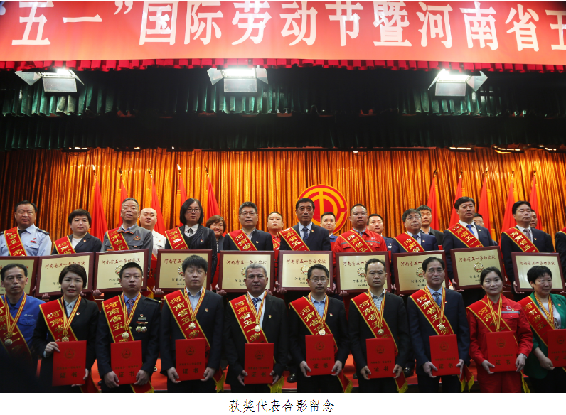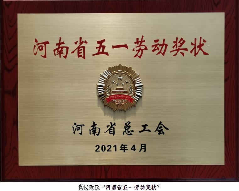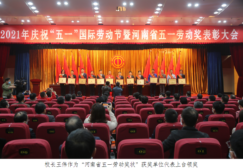4月29日,庆祝“五一”国际劳动节暨河南省五一劳动奖表彰大会在河南省总工会举行,省委常委、秘书长穆为民,省人大常委会副主任、党组副书记马懿,省政府副省长霍金花,省政协副主席李英杰等领导出席会议,会议表彰了2021年河南省五一劳动奖和工人先锋号,我校荣获“河南省五一劳动奖状”,校长王伟作为获奖单位代表上台领奖。