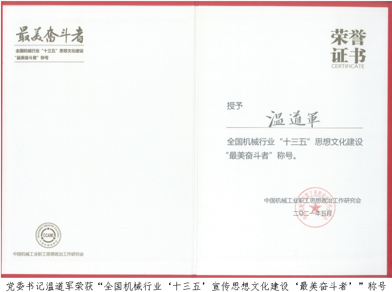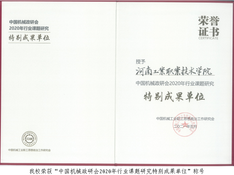 大会总结了机械政研会2020年工作,解读了机械工业企业文化建设“十四五”规划,发布了全国机械行业“十三五”先锋榜榜单。我校荣获“全国机械行业‘十三五’思想政治工作五十强”和“中国机械政研会2020年行业课题研究特别成果单位”,学校党委书记温道军同志荣获“全国机械行业‘十三五’宣传思想文化建设最美奋斗者”称号。