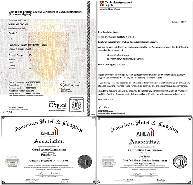 依托教育部剑桥英语证书考试CN162考点,国际教育学院(外语系)开展剑桥商务英语口试考官和剑桥通用英语五级考试口试考官的培训认证,同时,鼓励教师考取国际认可的职业资格证书,提高教师双师素质的同时,打造国际化的师资队伍。截止目前,国际教育学院(外语系)共有剑桥商务英语高、中、初级口试考官21人,剑桥通用英语五级证书考试KET、PET口试考官22人,7人考取剑桥商务英语高级证书、5人考取美国饭店协会教育学院注册酒店管理讲师证书、6人考取美国饭店协会教育学院金质服务师证书,22人在相关国际组织任职,为学校国际化师资队伍建设提供强有力支撑。