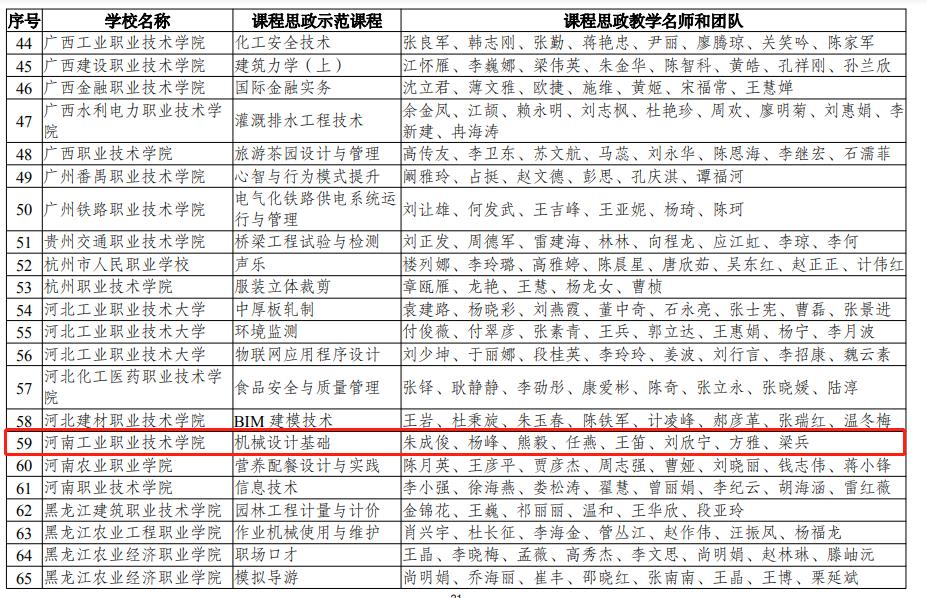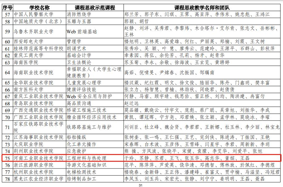 2021年6月10日,教育部印发《关于公布课程思政示范项目名单的通知》(教高函〔2021〕7号),确定课程思政示范课程699门、课程思政教学名师和团队699个、课程思政教学研究示范中心30个,其中普通本科教育300门,研究生教育99门,职业教育200门,继续教育100门。我校《机械设计基础》《工程材料与热处理》2门课程及团队被确定为课程思政示范课程、课程思政教学名师和团队。