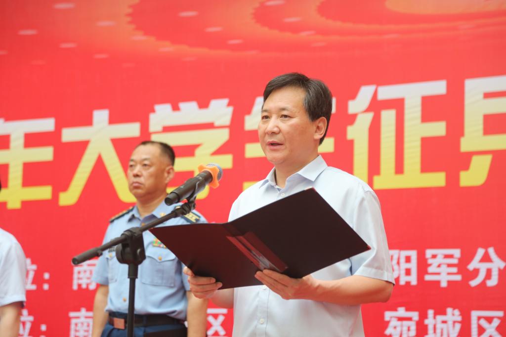 6月25日上午,南阳市2021年大学生征兵集中宣传活动仪式在孔明路校区图文信息楼二楼大厅举行,市委常委、军分区司令员许言龄,市征兵领导小组组长、市政府副市长石秀田,校党委书记温道军,校长王伟,军分区副司令员杨保军,军分区动员处处长卢成轶,校工会主席屈保中出席仪式,各县(市、区)征兵办公室主任,南阳市各高校武装部长以及师生代表500余人参加活动。仪式由南阳军分区副司令员杨保军主持。