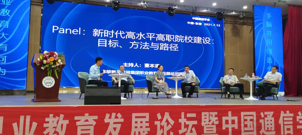 会上,教育界专家围绕“数字时代下ICT职业教育发展”做了主题报告。我校校长王伟作为专家代表参加了“新时代建设高水平高职院校的目标、方法与路径”主题开展圆桌论坛,王校长从人才培养质量、治理体系和信息化建设三个方面对推进双高校进程展开了论述。