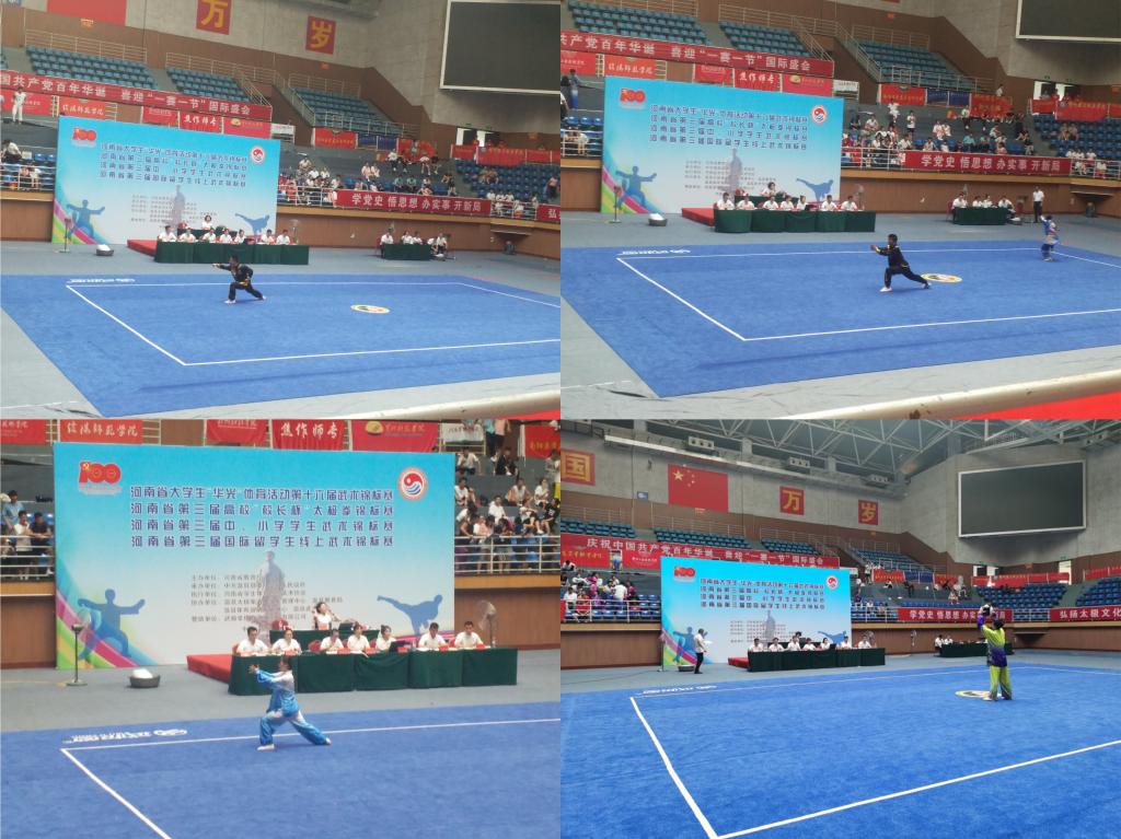 2021年7月14日-19日,2021年河南省“华光”体育系列活动暨河南省第十六届大学生武术锦标赛,在焦作温县陈家沟国际交流中心落下了帷幕,本次赛事由河南省教育厅主办。比赛为期6天,分为大学生组、中小学生组、留学生组以及高校“校长杯”太极拳比赛,来自河南省的62所高校、66所中小学、66名留学生以及38名高校领导共1200余名运动员参加。我校参加了大学生组和留学生组两个组别的赛事。其中,留学生组因疫情等方面的原因,采用线上比赛的形式同时进行。