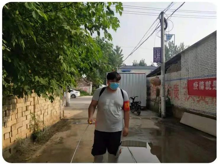 刚刚挨家挨户统计完外来人员信息,汗水未干,汽车与航空工程学院新能源汽车技术1903班张浩又背起消杀器材对自己所在的濮阳县清河头乡东大韩村的各个角落,进全面行消杀,尤其是村里广场、健身器材、菜市场等位置进行了重点消杀,不放过任何一个地方,不留一个死角,确保村庄能够安全防控新冠肺炎病毒和其他病毒细菌的侵害,他用喷雾器为居民和病毒之间撑起了一把保护伞,为家乡平安吹起冲锋号。