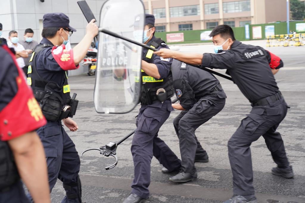本次演练进行两个科目的应急处置,科目一是外来人员拒不接受戴口罩、扫码、测温的要求,值班门卫再三讲明学校门岗值班要求,但是外来人员仍侮辱谩骂门卫,并暴力攻击门卫,试图闯岗。门卫一人持警械、一人对讲机通报呼叫增援,值班巡逻和特警立即赶到现场,将其制服,移交公安机关。随后,进行了科目二的演练,由特警支队警训教官孙鹏现场指导保卫和保安人员防暴器械的使用方法和防暴器械的组合使用,还演示了制服暴恐分子的有效方法。