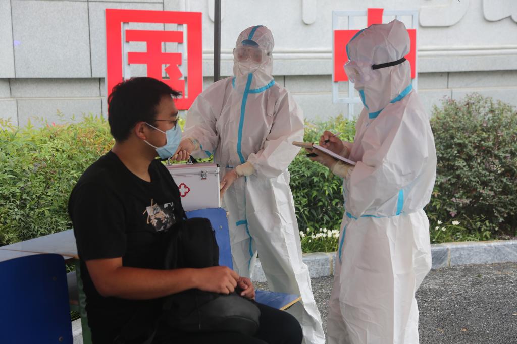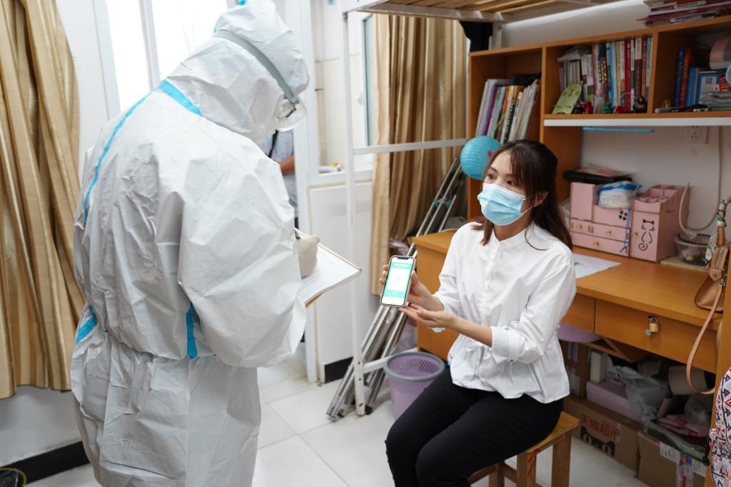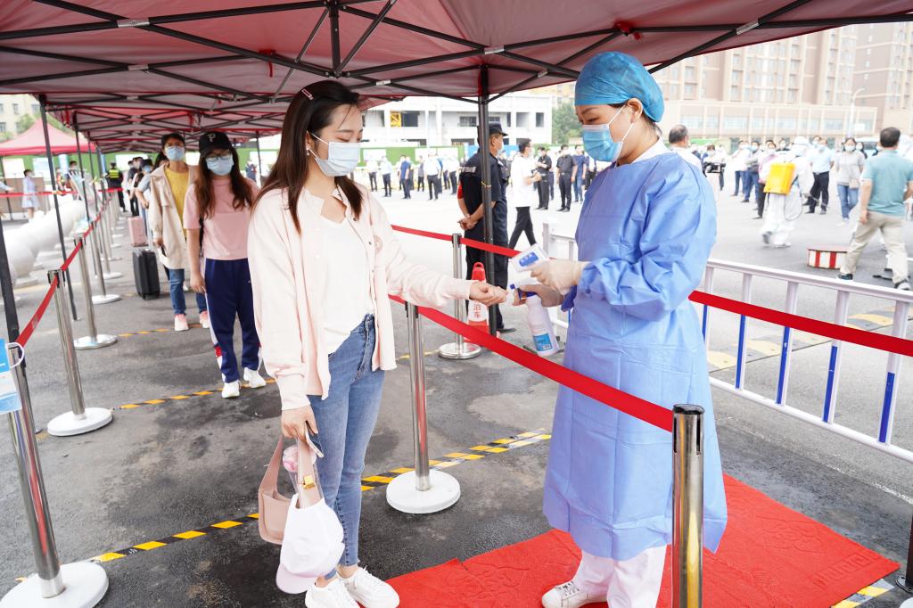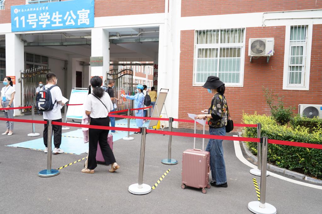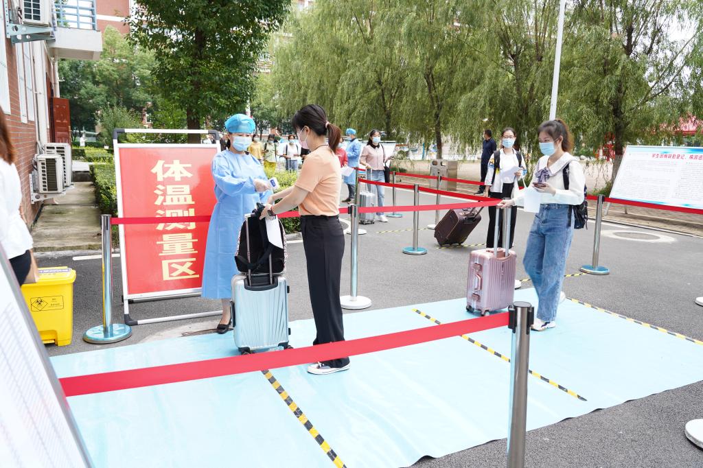 在学生公寓,学生进入公寓的流程及注意事项等展板迎面可见,学生陆续报到入住,工作人员在学生公寓入口处查验学生身份及健康码,完成体温检测、杀菌消毒等程序后,学生保持1米间距有序进入公寓。