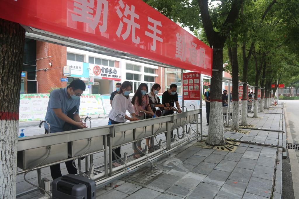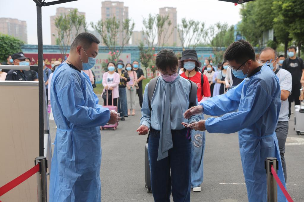 在学校南大门,防疫工作人员恪尽职守,入校流程规范严谨。学生持学生证或校园一卡通进行身份核验,出示通信行程大数据卡、防疫健康信息码和48小时内核酸检测阴性证明,进行测温以及行李、脚底和手消毒,更换口罩后进入校园。