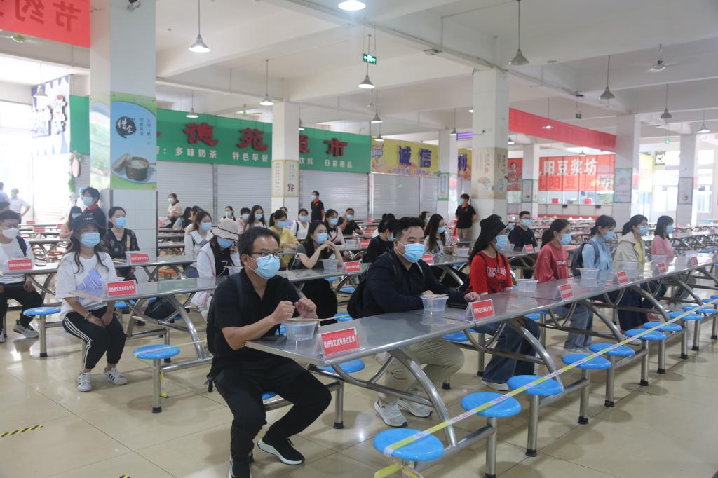 在餐厅门前,醒目的疫情防控宣传展板、就餐流程图、温馨提示牌引导学生有序购餐、用餐。演练开始后,就餐人员按照指引洗手、排队、测温消毒后进入餐厅,在就餐窗口前一米线排队取餐,单人单桌同向入座就餐。