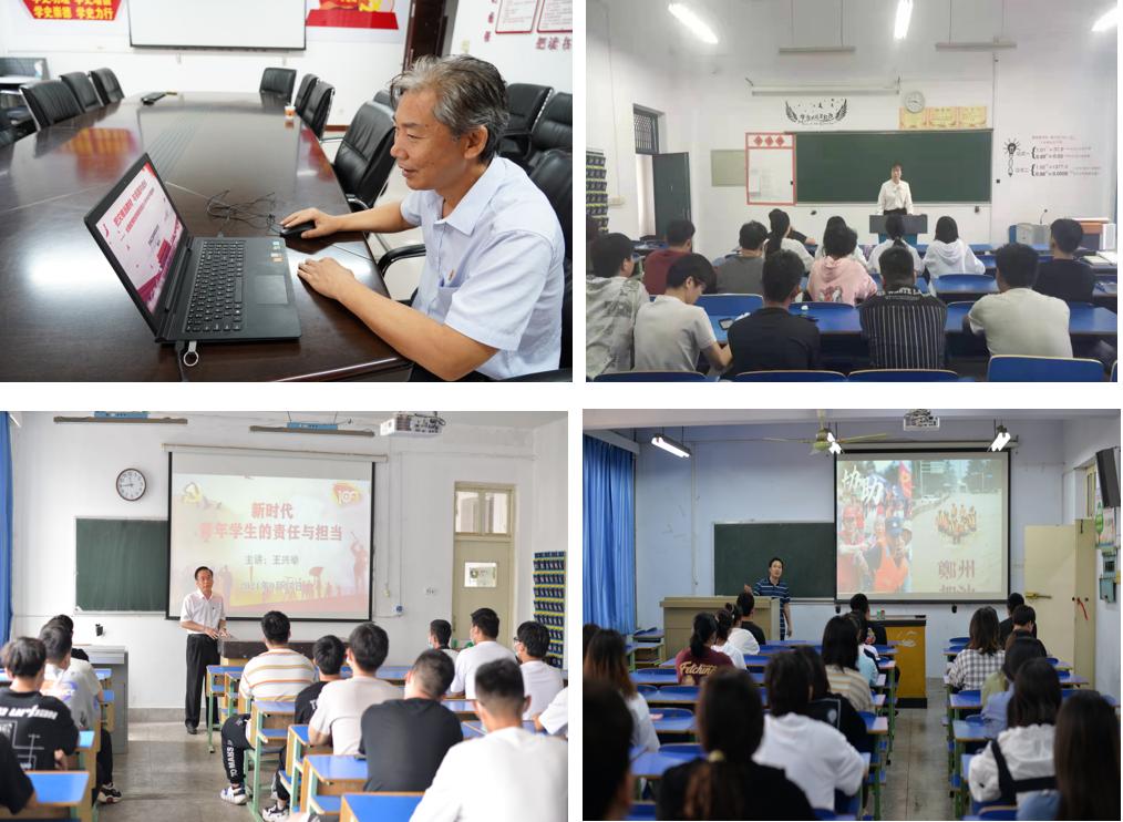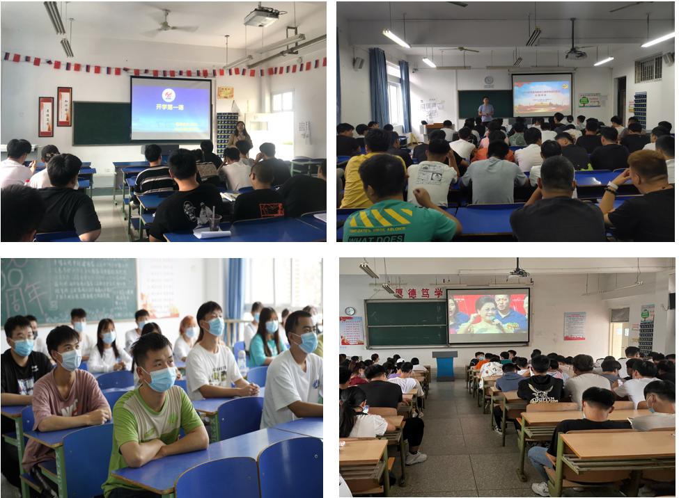 下午15:10,各学院按照学校的统一部署,结合本学院实际,聚焦“抢险救灾”和“疫情防控”主题,挖掘社会大众和学校师生中的典型事迹、人物,以灵活多样、生动活泼的形式开展教育活动。各学院领导做“把灾难当教材 与祖国共成长”专题讲座,并带领同学们观看了“请党放心 强国有我”——“出彩河南人”楷模发布厅开学特别节目。各班级班主任主持开展形式多样的主题班会,并带领同学们同唱一首爱国歌曲。