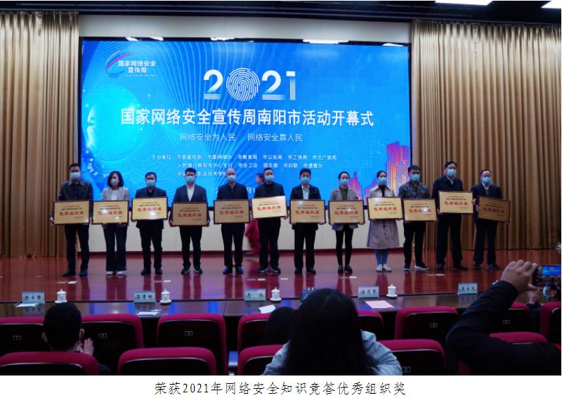 开幕式上,马冰、石秀田、温道军为荣获2021年网络安全知识竞答优秀组织奖的20家单位颁奖。随后,市委宣传部副部长、市委网信办主任孙起照,市公安局党委副书记、副局长高岭,南阳日报社党委副书记、总编辑梁玉振为南阳网络安全专题网站开通共同按下启动球。