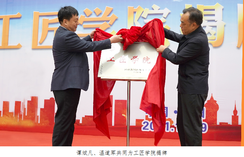 温道军向与会领导和来宾表示欢迎和感谢,向河南省国防邮电工会工匠学院揭牌表示热烈祝贺。温道军表示,河南省国防邮电工会工匠学院的成立是大力弘扬劳模精神、劳动精神、工匠精神的实际举措,是进一步发挥劳模工匠示范引领带动作用,让更多大国工匠和劳动模范参与人才培养的有效途径,对推动产教融合发展,提升高技能人才能力水平,培养更高素质职业技能人才、能工巧匠、大国工匠具有重要意义。河南省国防邮电工会工匠学院在学校揭牌成立,并进行首期工匠人才培训,这既是对学校的充分信任和殷切希望,也是对学校产教融合、校企合作的大力支持,学校将不断探索学院新的发展方向和特色,争取早出成果,多出优秀成果。