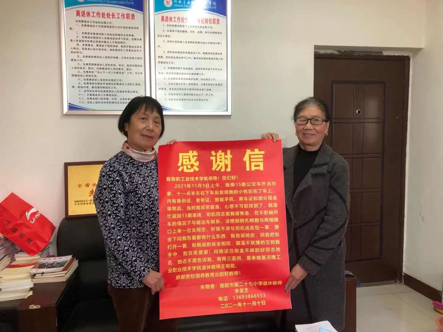 11月9日上午,我校退休职工王明茹在乘坐15路公交外出时,发现在车座上遗留一手提包,内有身份证、老年证、手机和现金。她立即将手提包保管好并主动寻找失主,失主就是这封感谢信的作者南阳市第二十七小学退休教师李荣芝。