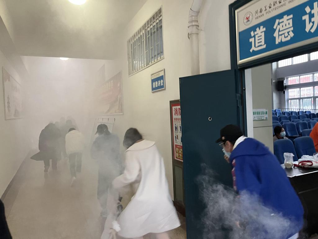 讲座结束后,举行了消防安全疏散演练活动。随着消防安全演练指令响起,小报告厅外浓烟升起,参演师生按照疏散方案要求,用湿毛巾堵住口鼻,迅速而有序地撤离至安全地点。