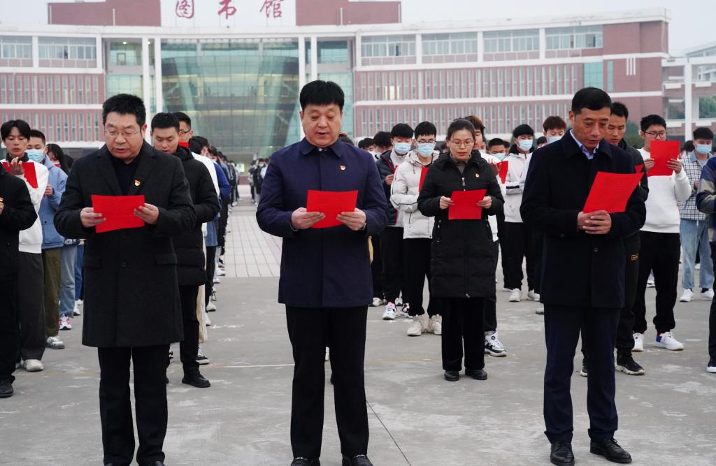 为推动学习宣传宪法,弘扬宪法精神,11月29日,学校在孔明路校区、光武路校区同时举行2021年宪法宣传周升旗仪式暨“宪法晨读”活动。党委书记温道军、校长王伟、副校长王仁伟出席,中层领导干部和各学院师生代表参加。孔明路校区活动由汽车与航空工程学院党总支书记王浩主持,光武路校区活动由建筑工程学院团总支书记朱宗海主持。