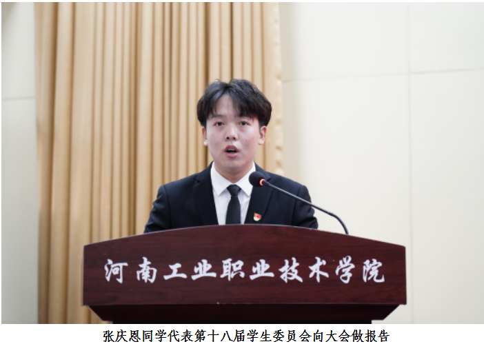 张庆恩同学代表学校第十八届学生会做题为《持续深化改革 团结带领工院学子奋发有为 创造工院新的辉煌》的工作报告,报告全面客观、实事求是地总结了第十八届学生会过去一年的工作,客观分析了新时代学生会工作面临的机遇和挑战并明确学生会未来的工作方面和任务。