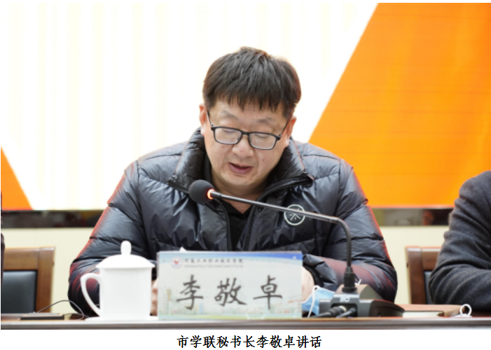 市学联秘书长李敬卓在致辞中表示,近年来河南工业职业技术学院共青团工作和学生会工作取得了诸多丰硕的成果,可喜可贺。立足党的百年历史的新起点,希望河南工院学生会要进一步增强青年的使命感和责任感,把握时代脉搏,坚持与时俱进,努力开创学校学生会工作新局面。