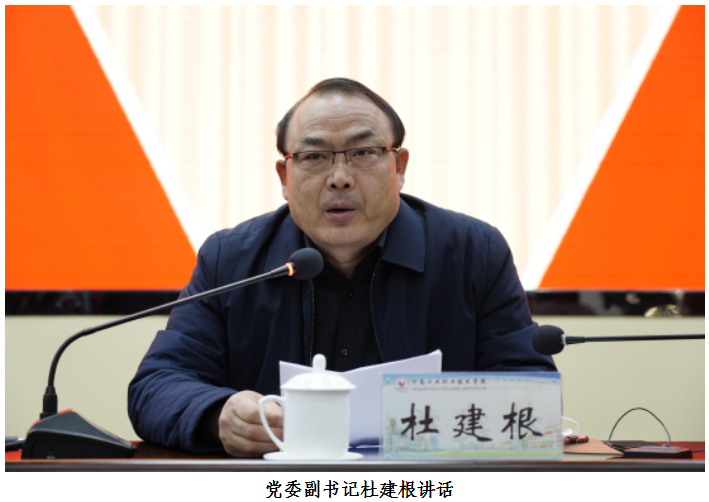 党委副书记杜建根讲话,对学校第十九次学生代表大会的胜利召开表示祝贺!他向学校广大青年学生和各级学生会组织提出几点要求,一是在厚植爱国情怀上下功夫,倾力打造信念坚定的学生干部队伍 ;二是在持续推进改革上下功夫,不断增强学生会的政治性、先进性和群众性;三是在提升服务质量上下功夫,切实构建清新的学生会组织;四是在增强综合素质上下功夫,努力成为堪当大任的时代新人。希望各级学生组织、广大学生携起手来,高举习近平新时代中国特色社会主义思想伟大旗帜,脚踏实地,以舍我其谁的主人翁精神,迎接新的挑战,在未来的日子里创造新的业绩,为河南工业职业技术学院高质量发展注入新的动力,为实现中华民族的伟大复兴贡献青春力量!