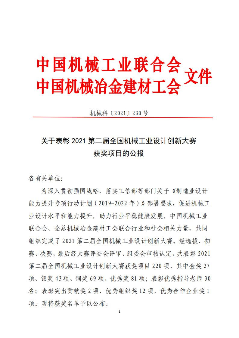 为深入贯彻强国战略,落实工信部等部门关于《制造业设计能力提升专项行动计划(2019-2022年)》部署要求,促进机械工业设计水平和能力提升,助力行业平稳健康发展,中国机械工业联合会、全总机械冶金建材工会联合行业和社会相关力量,共同组织完成了2021第二届全国机械工业设计创新大赛。全国机械工业设计创新大赛由中国机械工业联合会、全总机械冶金建材工会主办,是全国机械工业设计领域顶级赛事。
