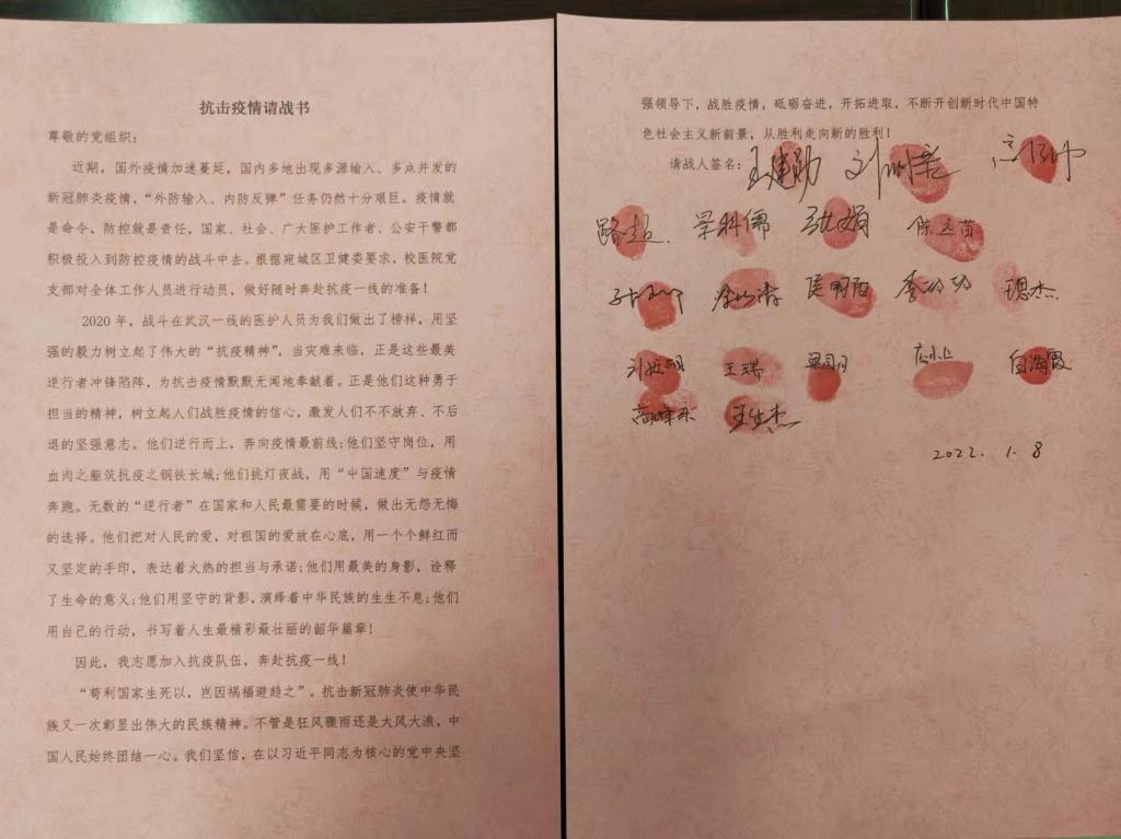 随后,在刘明黎和王建勋带领下,全体医护人员踊跃在《请战书》上签字,并庄重按下一个个鲜红的手印。当疫情来临,正是这些最美“逆行者”冲锋陷阵,为抗击疫情默默无闻地奉献,正是他们这种勇于担当的精神,树立起人们战胜疫情的信心,激发人们不放弃、不后退的坚强意志。他们坚守岗位,用血肉之躯筑起抗疫钢铁长城;他们挑灯夜战,用“中国速度”与疫情奔跑。无数的“逆行者”在国家和人民最需要的时候,做出无怨无悔的选择。他们把对人民的爱,对祖国的爱放在心底,用一个个鲜红而又坚定的手印,表达着火热的担当与承诺;他们用最美的身影,诠释了生命的意义;他们用坚守的背影,演绎着中华民族的生生不息;他们用自己的行动,书写着人生最精彩最壮丽的韶华篇章!