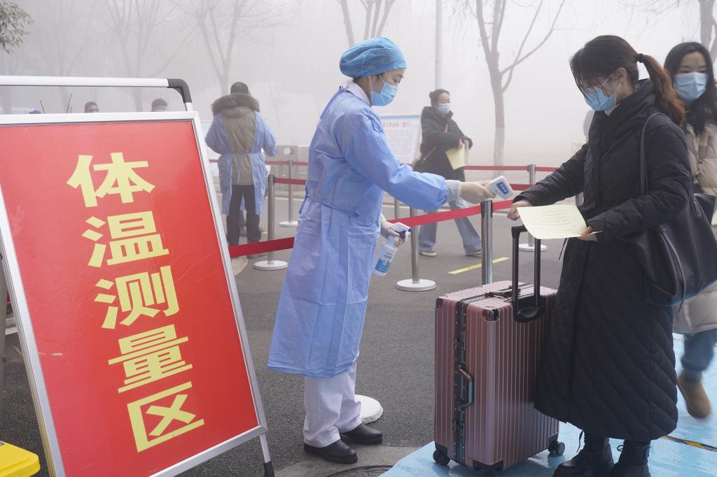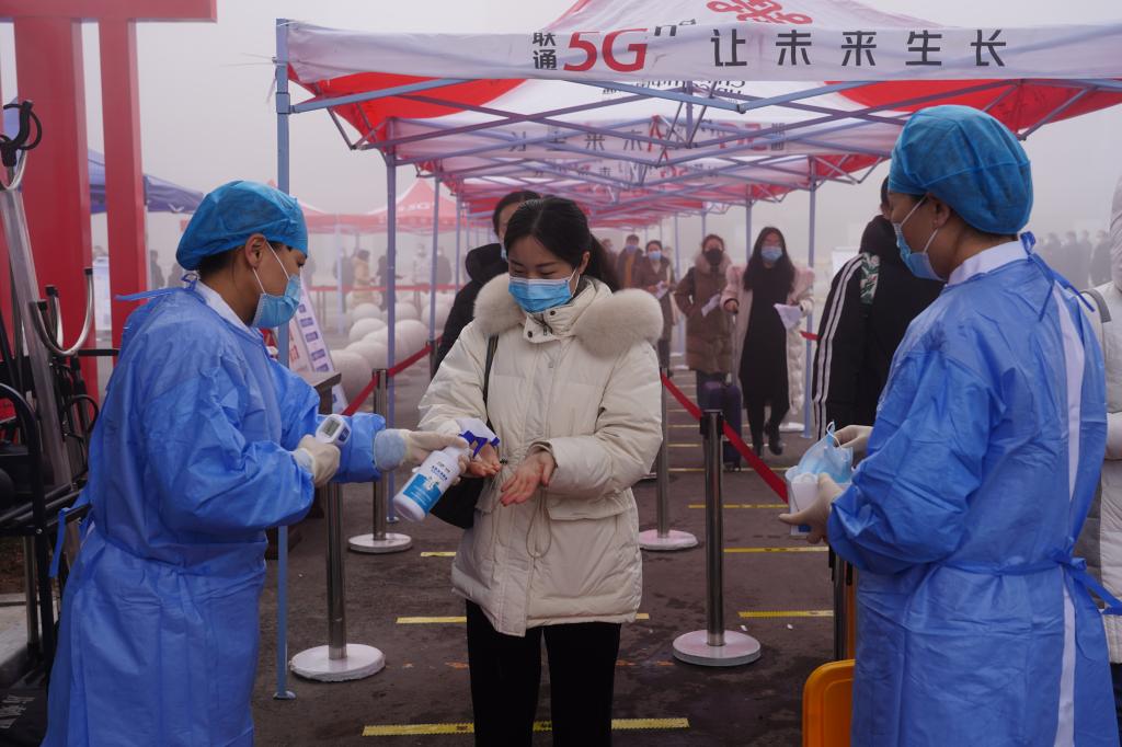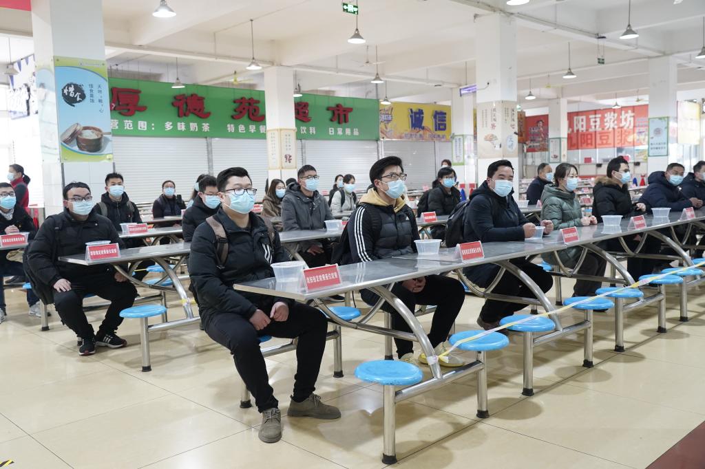 在孔明路校区南大门,学生在校门外沿规划路线间隔1米排队,依次持学生证或校园一卡通进行身份核验,查验通信行程卡、防疫健康信息码和48小时内核酸检测阴性证明,进行测温以及行李、脚底和手消毒,合格后,更换新口罩进入校园。